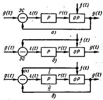 Принцип регулирования по отклонению поясняется схемой (рис. 2.6, а), состоящей из двух составных частей - объекта регулирования ОР и регулятора Р, взаимосвязанных между собой цепью обратной связи. Регулируемый параметр у(t) сравнивается с заданным значением g(t). На основании разности этих двух величин ε(t) = g(t) - у(t) вырабатывается регулирующее воздействие r(t).