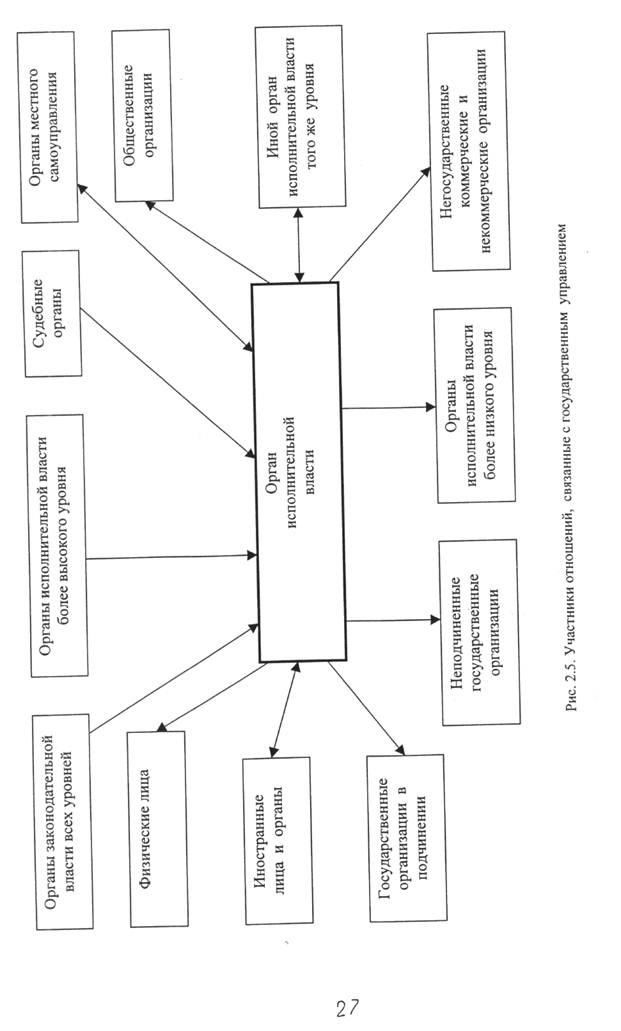 Административное право - отрасль права, рассматривающая отношения, связанные с государственным управлением, касающиеся организации и функционирования системы исполнительной власти. Поэтому хотя бы один из участников таких отношений является орган исполнительной власти (рис.2.5). Административное право тесно связано, прежде всего, с государственным правом, устанавливающим: институты исполнительной власти, порядок формирования и работы органов исполнительной власти (статьи 77,110 - 117 Конституции); разграничение предметов ведения между федерацией и ее субъектами (рассмотренные ранее), что определяет полномочия органов исполнительной власти; основные права и свободы граждан в области государственного управления (статьи 22,24 -25,27, 30 - 35 Конституции).