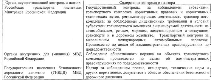 Государственные органы осуществляют контроль и надзор за деятельностью в транспортном комплексе. Общий надзор за соблюдением действующего законодательства осуществляет Прокуратура Российской Федерации. Судебные органы осуществляют надзор за исполнением приговоров и решений суда. Органы исполнительной власти осуществляют административный контроль и надзор в соответствии с их компетенцией.