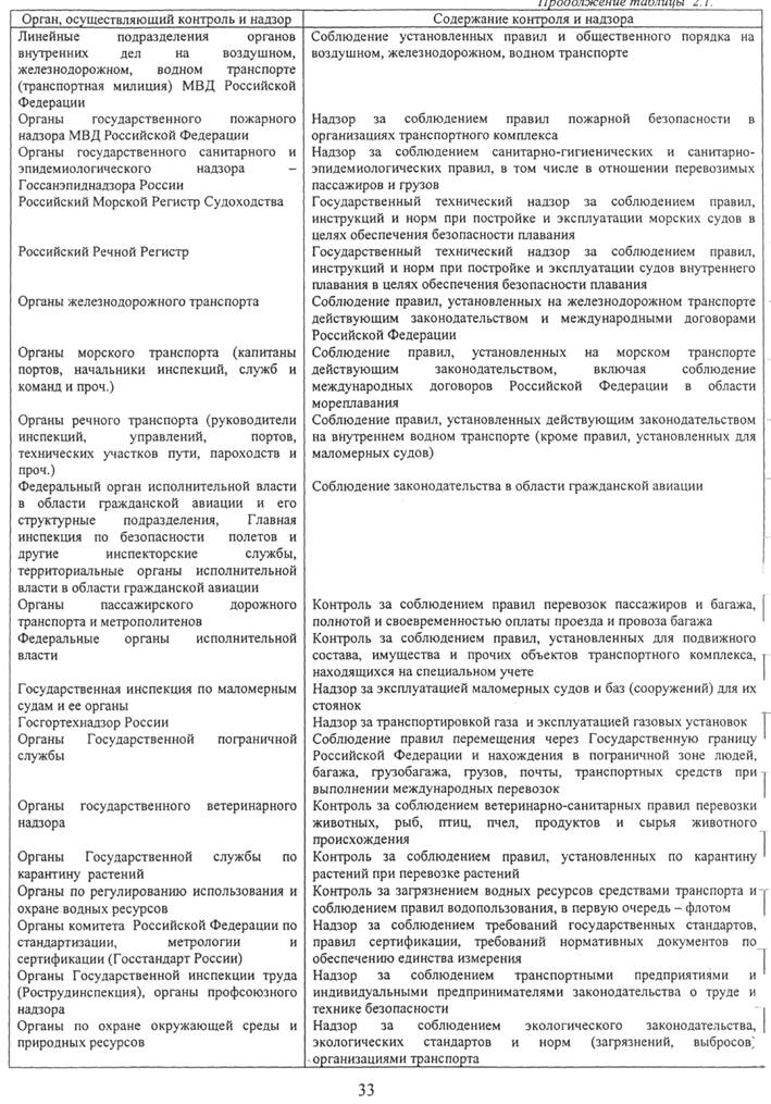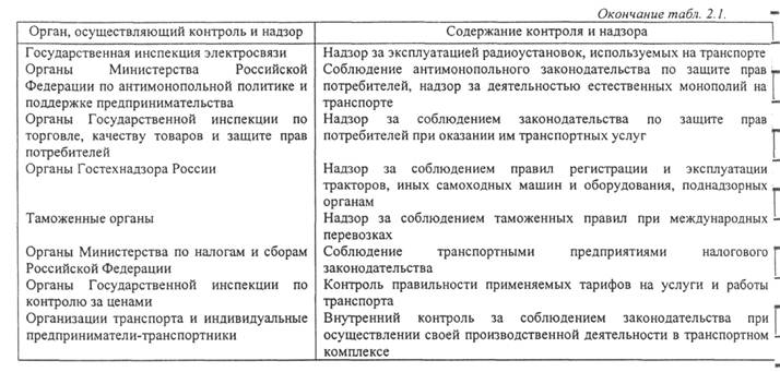 Организация контроля и надзора производится по признаку содержания подконтрольной и поднадзорной деятельности и с учетом установленного административно-территориального деления. Характеристика административного контроля и надзора и другой контрольно-надзорной деятельности в транспортном комплексе приведена в табл. 2.1.