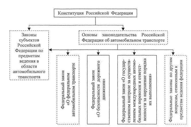 Рис. 3.2 Система правовой основы автомобильного транспорта (пунктиром выделены законы, разработка и принятие которых являются актуальными)