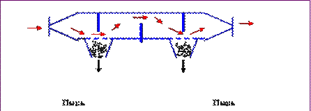 Загрязненный пылью газ (1) пропускается через камеру со скоростью 0,2 – 1,5 м/с, частицы пыли оседают под действием силы тяжести в нижней части аппарата. Степень очистки газа в камерах не превышает 40 – 50%.