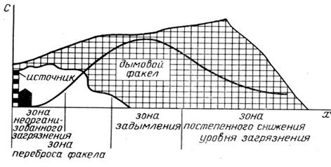 На рис. 9 показано распределение концентрации вредных веществ в атмосфере над факелом организованного высокого источника выброса. По мере удаления от трубы в направлении распространения промышленных выбросов концентрация вредностей в приземном слое атмосферы сначала нарастает, достигает максимума и затем медленно убывает, что позволяет говорить о наличии трех зон неодинакового загрязнения атмосферы: зона переброса факела выбросов, характеризующаяся относительно невысоким содержанием вредных веществ в приземном слое атмосферы; зона задымления - зона максимального содержания вредных веществ и зона постепенного снижения уровня загрязнения.