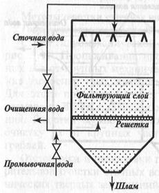 Фильтрование применяют для удаления из сточных вод частиц малых размеров. Под действием давления вода проходит через пористые перегородки или слой песка. Схема простейшего фильтра приведена на рис. 9.4. Фильтрующий слой аппарата необходимо время от времени промывать от накопившихся загрязнений. Для этого в фильтр снизу подается промывочная вода. При концентрации частиц 15—20 мг/л степень очистки от мелких частиц достигает 60%.