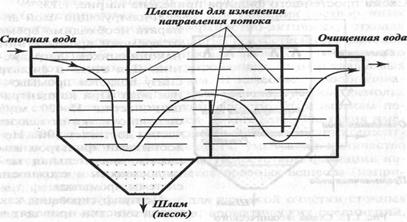 Отстойники и песколовки предназначены для предварительной очистки сточных вод от минеральных и органических твердых загрязнений со сравнительно большими размерами частиц (0,2-0,25 мм). На рис. 9.3 показана схема простейшего отстойника сбросов воды.