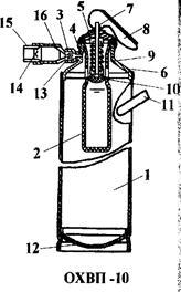 Огнетушители состоят из корпуса 1, кислотного стакана 2, предохранительной мембраны 4, спрыска 3, крышки 5, штока 7, рукоятки 8, пружины 9, горловины 6, клапана 10, боковой ручки 11, башмака 12. Кроме того, огнетушитель ОХВП-10 имеет дополнительно конфузор 15, корпус пенного насадка 16 с сеткой 14 и распылитель 13.