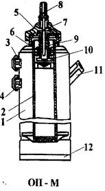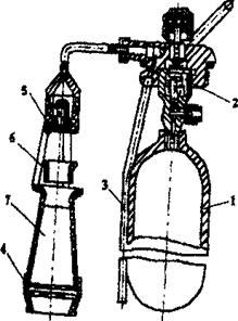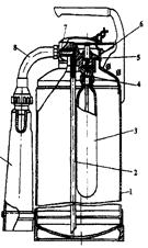 Устройство огнетушителя ОВПМ-8 показано на рис.1.3. Он состоит из стального цилиндрического корпуса-резервуара, крышки с баллоном 1 для рабочего газа (сжатый воздух), редукционного клапана 2. сифонной трубки 3 и пеногенераторной насадки 7.
