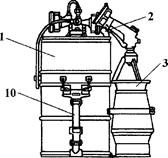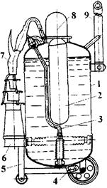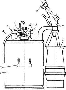 Рис.. Переносная пенная установка УППС-200: 1 - бак; 2 - ручка для переноски бака; 3 - гибкий шланг для забора пенообразователя из дополнительной емкости; 4 - гайка подсоединения рукава от противопожарной системы; 5 - эжектор; 6 - трехходовой кран; 7 - горловина для заливки пенообразователя; 8, 9-гайка подачи раствора пенообразователя; 10-клапан; 11 - пеногенератор.