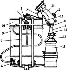 Генератор УППС-100 предназначен для тушения пожаров твердых и жидких горючих материалов, кроме боезапаса и электроустановок, находящихся под напряжением. Генератор (рис.1.10) состоит из ранца 10, гибкого шланга 9, пенного ствола в сборе 4 и крепления 7. Ранец 10 сварной из листовой стали, на верхнем донышке которого имеется горловина 1 с крышкой 2 для заливки пенообразователя через сетку-фильтр. В крышке 2 имеется отверстие для выравнивания давления воздуха в ранце с атмосферным. На боковой стенке в нижней части ранца установлен проходной кран 6, к которому присоединен гибкий шланг 9 подачи пенообразователя к генератору 4. На верхней крышке ранца установлен кронштейн 3 крепления пеногенератора. Пеногенератор состоит из корпуса 14, запорного клапана 5 с ручкой 13, диффузора 8, турбинки 15, спрыска 12 и пенного ствола 11. К корпусу клапана крепится соединительная гайка с крышкой.