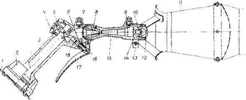 Рис.. УТШС-100. Пенный ствол в сборе: 1,9 - заглушка (крышки); 2 - гайка PC; 3 - корпус клапана; 4 - гайка; 5 - клапан; 6 - пружина; 7 - втулка, 8 - насадок; 10 - втулка; 11 - пенный ствол; 12 - спрыск; 13 - хомутик; 14 - турбинка; 15 - диффузор; 16 - ось; 17 - ручка; 18 - резиновое кольцо.