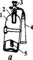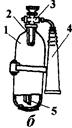 Огнетушитель ОУ (рис.1.6г) предназначен для установки на транспортных средствах и отличается от других типов тем, что его корпус 1 армирован стальной оплеткой для зашиты от осколков при разрыве баллона. Внутри корпуса находится сифонная трубка 5, через которую жидкая углекислота подается в раструб 3. Затвор ЗПУ огнетушителя пистолетного типа. Рис. 1.6