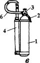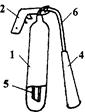 Наибольшее распространение получили ручные углекислотные огнетушители типа ОУ-2, ОУ-5, ОУ-8 (рис.1.6,а,б,в). Они состоят из стального баллона 1, в горловину которого на конусной резьбе ввернуто запорно-пусковое устройство (ЗПУ) с сифонной трубкой 5. раструба - "снегообразователя" 4. У огнетушителей ОУ-2 и ОУ-5 раструб непосредственно присоединен к корпусу ЗПУ шарнирно, а у ОУ-8 - с помощью гибкого резинотканевого рукава 6 высокого давления. Для переноски огнетушителей на горловине или корпусе баллона с помощью хомута закреплена рукоятка 2.