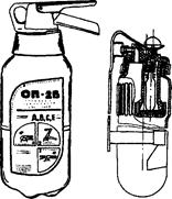 На судах принят на вооружение огнетушитель самосрабатывающий порошковый ОСП. Он представляет собой герметичный стеклянный сосуд и заполняется огнетушащим порошком массой 1кг. Огнетушитель устанавливается в металлический держатель над местом возможного возгорания и срабатывает при температуре 100 или 200°С. Импульсный выброс огнетушащего порошка в защищаемый объем (до 8м3) приводит к высокоэффективномутушению. Область применения: электрические,складские, бытовые помещения, кабельные туннели, небольшие хранилища ЛВЖ и ГСМ, отдельные технологические установки.