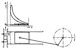 К моменту поступления заряда воздуха в цилиндр двигателя открывается всасывающий клапан. Точка 1 соответствует положению кривошипа в момент открытия клапана. Для лучшего наполнения цилиндра воздухом всасывающий клапан открывается до ВМТ и закрывается после перехода поршнем НМТ на угол равный 20-40° п.к.в., который обозначается как угол опережения и запаздывания впускного клапана. Обычно угол п.к.в. соответствует процессу впуска равного 220-240°. Когда клапан закрывается наполнение цилиндра заканчивается и кривошип занимает положение, соответствующее точке (2).