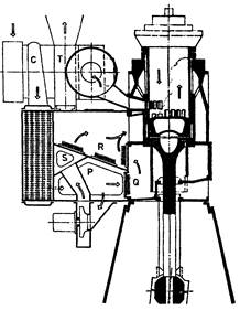 Поток продувочного воздуха, поступая через окна, описывает внутренний контур цилиндра. Затем, поднимаясь вверх, у крышки цилиндра он совершает петлю и движется вниз к выпускным окнам.