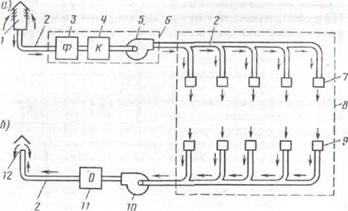 а - приточная вентиляция; 6-вытяжная вентиляция; 1 - воздух приемник, 2 - воздуховоды; 3 - фильтр, 4 - калориферы, 5 - приточный вентилятор, 6 - вентиляционная камера, 7 - воздухораспределительные устройства; 8 - обслуживаемого помещения; 9 - повитрянозабирни отверстия, 10 вытяжной вентилятор; 11 - устройство для очистки удаляемого: 12 - устройство для выброса воздуха