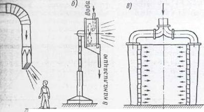 Вытяжные зонты (рис. 4б) предназначены для улавливания потоков вредных вы-делений, направленных вверх. Ими оборудуют кузнечные горны, рабочие места раз-борки и промывки карбюраторов, приготовления резинового клея, ремонта и задел-ки поврежденных шин или камер, плавки свинца, приготовления и слива электроли-та, станки для сборки и разборки аккумуляторных батарей, ванны для окисление се-параторов, стол маляра и, стол для приготовления красок и ряд других мест.