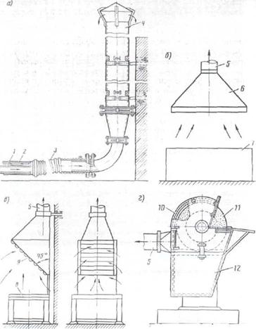 а - шланговый отсос б - вытяжной зонт; в - вытяжная панель С. А. Чернобережс-кого; м - кожух; 1 - труба глушителя автомобиля; 2 - наконечник гибкого шланга, 3 - шланг, 4 - устройство для выброса газа, отработал, в атмосферу; 5-вытяжной воздух вод; 6 - вытяжной зонт; 7 - кузнечный горн; 8 - рабочий стол; 9 - вытяжная панель; 10 - кожух, 11 - абразивный круг; 12 - бункер для сбора пыли.