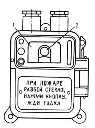 Рис. 3. Пожарный кнопочным извещатель типа ПКИЛ-4М-1: 1 - стекло, 2 - кнопка