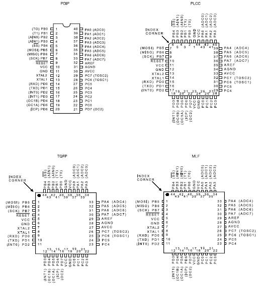 Микросхема AT90S8535 выпускается в четырех типах корпусов: PDIP, PLCC, TQFP и MLF (рис.2.1). Основное назначение выводов следующее: