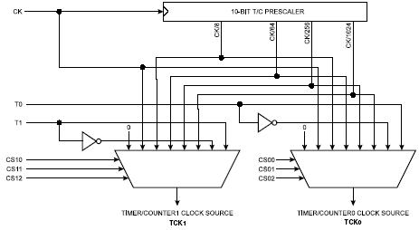 В качестве источника импульсов для таймеров можно выбрать сигнал с тактовой частотой процессора (CK), импульсы предварительного делителя (CK/8, CK/64, CK/256 или CK/1024) или импульсы с соответствующего внешнего вывода. Кроме того, таймеры могут быть остановлены, запретом прохождения импульсов на них (рис.5.1).