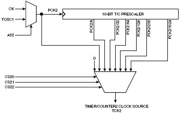Источник тактового сигнала для предделителя ТС2 называется PCK2. PCK2 по умолчанию подсоединен к основному системному источнику тактовых импульсов (CK). при установке бита AS2 в регистре ASSR, предделитель для ТС2 тактируется асинхронным образом от импульсов, приходящих на ножку PC6 (TOSC1). Это дает возможность использовать ТС2 в качестве часов реального времени (Real-Time Clock, RTC).