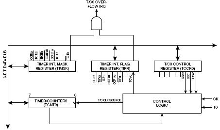 8-разрядный таймер/счетчик может получать импульсы тактовой частоты - CK, импульсы с предварительного делителя (CK/8, CK/64, CK/256 или CK/1024), импульсы с внешнего вывода или быть остановлен соответствующими установками регистра TCCR0 (рис.5.2). Флаг переполнения таймера находится в регистре TIFR. Биты управления таймером расположены в регистре TCCR0. Разрешение и запрещение прерываний от таймера управляется регистром TIMSK.