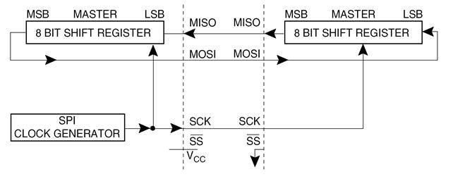 Соединение двух микроконтроллеров (ведущий ведомый) по интерфейсу SPI показано на рис.8.5. Вывод SCK ведущего микроконтроллера является выходом тактового сигнала, а ведомого микроконтроллера — входом.