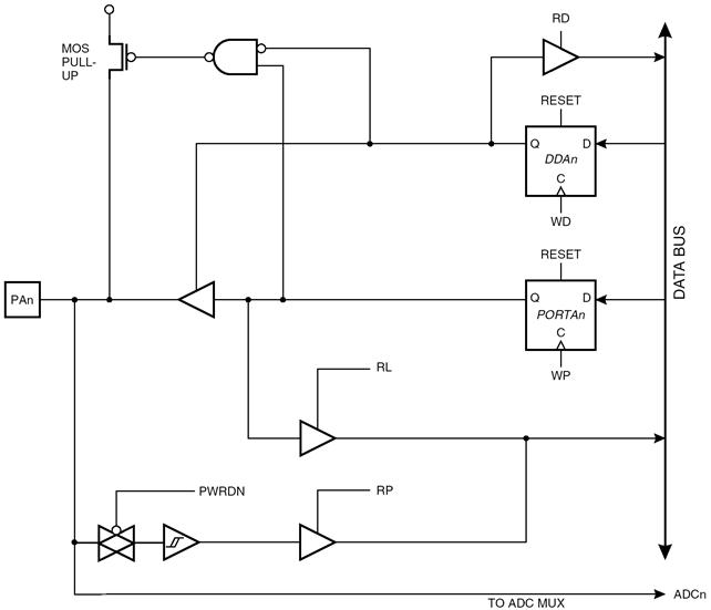 Управление подтягивающим резистором осуществляется с помощью регистра данных порта PORTx. Если разряд Рхп регистра PORTx установлен в «1» и соответствующий вывод порта является входом, между этим выводом и проводом питания подключается подтягивающий резистор. Чтобы отключить подтягивающий резистор, необходимо либо сбросить соответствующий разряд регистра PORTx, либо сделать вывод порта выходом.