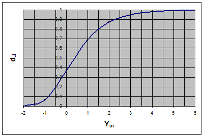где dui – частные отклики факторов, переведенные в безразмерную шкалу желательности, которая имеет интервал от нуля до единицы; yui – кодированная шкала, значения которой обычно выбираются от -2 до 6, а обобщают по формуле