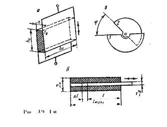 При измерениях связанных с вращением или поворотом исследуемого узла, используют преобразователи, подобные переменным конденсаторам. Статор 1 этих конденсаторов обычно жестко закрепляется на неподвижной детали, а ротор 2 жестко связывается узлом, угол поворота которого подлежит изменению.