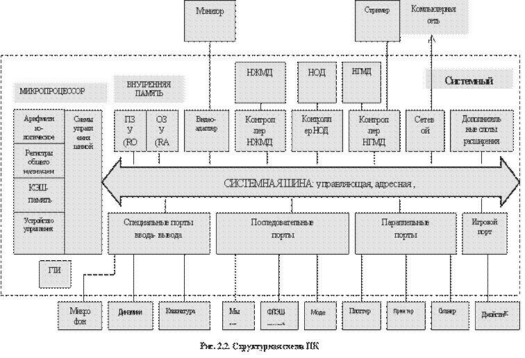 2)Типовой(дополн. к бозовому) использ-ся и принтер 3)Расширенный включ. ряд дополн.устройств.Все устройства компа связаны между собой.Ср-ва связи м/у устр-вами и блоками маш-ны назыв-ют аппар-ным интерфейсом. Технич интерфейс представл собой совокуп-ть логич устр-тв, объед-ых унифиц-ным набором свзяей и предназнач-ых для обеспеч информа-ой и конструк-ной совмес-сти. Интерфейс-ые платы предназна-ны для расширен конфиг-ии компа и обеспеч-ют согласован аппарат сред-тв. Сущ-ет 2 типа аппарат интерфейса:-радиал-ый(каждое устр с др устр-ом);-магистр-ный(имеет магис-ль к кот подкл др устр-ва), встр и комбинир интерфейсы. Главный в компе сис блок, в кот входят микропроц-ор(реализов-н в виде интегральной схемы и вкл в себя арифмет-логич устр-во и устр-во управл-я), сопроц-ор(повыш производит компа вцелом), генер-ор такт-вых импульсов(управл кол-вом тактов в сек), постоян запомин устр-во, оперативн запомин устр-во, накопит на жестк магнит дисках, … на гибких магнит дисках, … на оптич диске, контролеры, системн шина(сис шина и контролеры – для обмена инфой м/у операт памятью и внешн устр-вами)