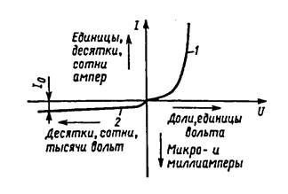 Вольт-амперная характеристика р-n-перехода. Зависимость тока через электронно-дырочный переход от приложенного напряжения называется вольт-амперной характеристикой (ВАХ). Физические явления прямого и обратного переходов были рассмотрены выше. На рис. 1. приведена ВАХ идеализированного р-n- перехода.