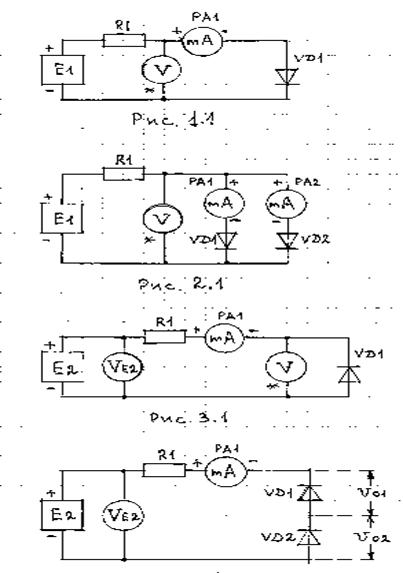 На лабораторных стендах, согласно схемам исследования, приведенным на рис. 1. были получены опытные данные по исследованию прямой и обратной ветви ВАХ двух различных диодов, а также обратной ветви ВАХ стабилитрона