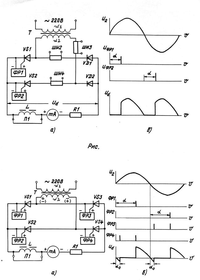 - при a=900 указать величину выпрямленного напряжения Ud, напряжения на диоде VD1, напряжения на тиристоре VS2. Указать углы коммутации тиристоров и диодов.