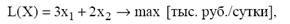 В условии задачи сформулирована цель – добиться максимального дохода от реализации продукции. Т.е. критерием эффективности служит параметр суточного дохода, который должен стремиться к максимуму. Чтобы рассчитать величину суточного дохода от продажи красок обоих видов, необходимо знать объемы производства красок, т.е. x1 и x2 т краски в сутки, а также оптовые цены на краски 1-го и 2-го видов – согласно условию, соответственно 3 и 2 тыс. руб. за 1 т краски. Таким образом, доход от продажи суточного объема производства краски 1-го вида равен 3 x1 тыс. руб. в сутки, а от продажи краски 2-го вида – 2x2 тыс. руб. в сутки. Поэтому запишем целевую функцию в виде суммы дохода от продажи красок 1-го и 2-го видов (при допущении независимости объемов сбыта каждой из красок)