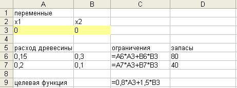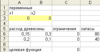 В ячейки А3:В3 будет помещен результат, в ячейках А6:В7 записаны коэффициенты технологической матрицы, в ячейки С6:С7 занесены ограничения, в ячейки D6:D7 занесены имеющиеся запасы.