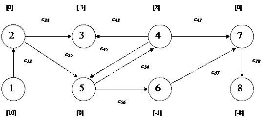На рис 8 видно, что суммарный избыток товара, имеющийся на складах системы с номерами 1 и 4, равен суммарному недостатку товара, имеющемуся на складах с номерами 3, 6 и 8 той же системы. Перераспределение товара может происходить через склады с номерами 2, 4-7, которые в рассматриваемой задаче и являются промежуточными или транзитными пунктами. Истинным пунктом отправления является лишь склад с номером 1, на котором имеется избыток товара и с которого товар можно только вывозить, а истинными пунктами назначения являются склады с номерами 3 и 8, на которых есть недостаток товара, и на эти склады товары можно только завозить. Заметим также, что между складами с номерами 4 и 5 возможны перевозки в обоих направлениях, но в общем случае c45 ¹ c54 (например, наличие одностороннего движения по кратчайшему маршруту). Объемы спроса и предложения, соответствующие этим пунктам отправления и назначения, вычисляются следующим образом: