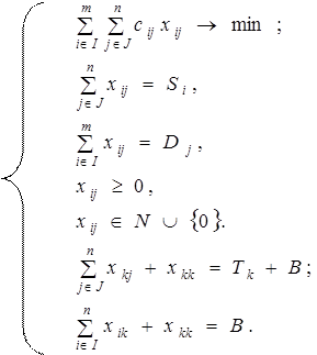 Пусть J — множество номеров складов, на которые товар может быть доставлен с k -го склада, а I — множество номеров складов, с которых товар может быть доставлен на k -й склад. Tk — величина чистого запаса товара, равная объему исходного предложения или исходного спроса. Тогда математическую модель данной задачи можно представить следующим образом:
