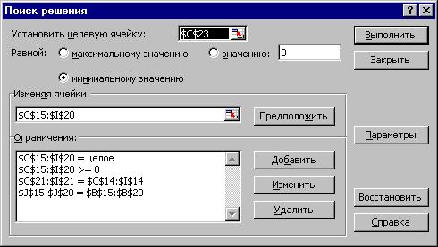 Используя меню СервисÞПоиск решения открываем диалоговое окно Поиск решения (см. рис. 10), в котором устанавливаем целевую ячейку равной минимальному значению, определяем диапазон изменяемых ячеек и ограничения и запускаем процедуру вычисления, щелкнув по кнопке Выполнить.