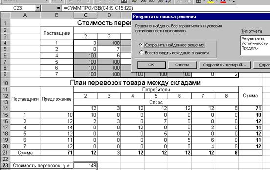 На рис. 9 представлены таблицы Стоимость перевозки единицы товара и План перевозок товара между складами, сформированные на рабочем листе Excel. Здесь в таблице Стоимость перевозки единицы товара мы видим, что если между отдельными складами отсутствует возможность перевозки товара, то в соответствующие ячейки таблицы (выделенные темным фоном) заносится любое большое число (в данном случае 100). Для того, чтобы найти в таблице Плана перевозок товара между складами объем предложения и объем спроса, определим объем буфера B по следующему правилу: