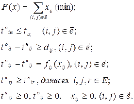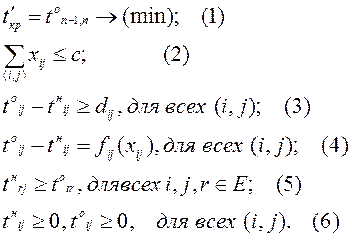 Пусть задан сетевой график выполнения комплекса операций. Время выполнения каждой операции равно tij. Пусть также вложение дополнительных средств в операцию сокращает время выполнения с tij до t’ij. Естественно, для каждой операции существует минимально возможное время ее выполнения, равное dij. Требуется определить время начала и окончания выполнения операций, а также величину дополнительных средств xij, которые необходимо вложить в каждую из операций (i, j), чтобы общее время выполнения комплекса операций было минимальным. При этом сумма вложенных дополнительных средств не должна превышать заданной величины c, а время выполнения каждой операции должно быть не меньше минимально возможного времени dij.