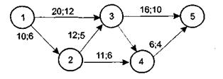 Для сокращения срока реализации проекта, представленного сетевым графиком (рис.10), заказчик выделил 14 ед. дополнительных средств. Продолжительность выполнения работ линейно зависит от дополнительно вложенных средств и выражается соотношением t'ij = tij - kij xij. Известно, что kl2=0,1; k13 = 0,2; k23 = 0,5; k24 = 0,3; k35 = 0,6; k45 = 0,1. Над каждой работой поставлена ее продолжительность tij и минимально возможное время выполнения dij.