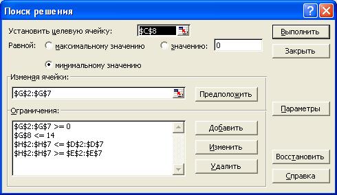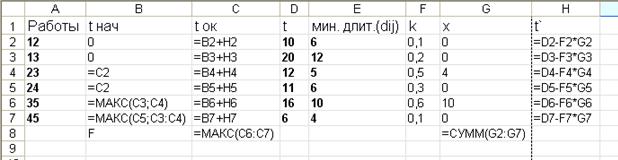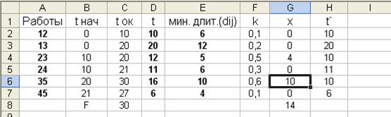 Ограничение (2) определяет сумму вложенных дополнительных средств: она не должна превышать величины c. Ограничения (3) показывают, что продолжительность каждой работы должна быть не менее минимально возможной ее продолжительности. Ограничения-равенства (4) показывают зависимость продолжительности каждой работы от вложенных в нее дополнительных средств. Ограничения (5) обеспечивают выполнение условий предшествования работ в соответствии с топологией сети: время начала выполнения каждой работы должно быть не меньше времени окончания непосредственно предшествующих ей работ, (6) — условие неотрицательности.