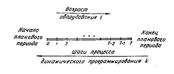 Решение. Чтобы решить задачу, применим принцип оптимальности Р. Беллмана. Рассмотрим интервалы (годы) планового периода в последовательности от конца к началу. Введем функцию условно-оптимальных значений функции цели Fk(t). Эта функция показывает максимальную прибыль, получаемую от оборудования возраста t лет за последние к лет планового периода. Здесь возраст оборудования рассматривается в направлении естественного хода времени. Например, t = 0 соответствует использованию совершенно нового оборудования. Временные же шаги процесса нумеруются в обратном порядке. Например, при к = 1 рассматривается последний год планового периода, при к = 2 — последние два года и т. д., при к = Т — последние Т лет, т. е. весь плановый период. Направления изменения t и к показаны на рисунке.