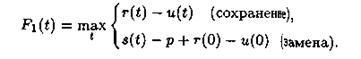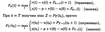Для количественной формулировки задачи введем следующие обозначения: r(t) — стоимость продукции, производимой за год на единице оборудования возраста t лет; u(t) — расходы, связанные с эксплуатацией этого оборудования; s(t) — остаточная стоимость оборудования возраста t лет; р — покупная цена оборудования; Т — продолжительность планового периода; t = 0,1, 2,..., Т — номер текущего года.