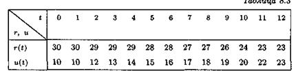Придадим параметру t значения 0,1,2,...,12, значения r(t) и u(t) возьмем из табл. 8.3, а значения F1(t + 1) — из первой строки табл. 8.4. Для третьей строки расчетную формулу получим из равенства (8.10) при к = 3: