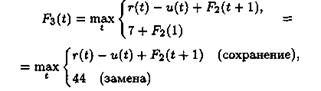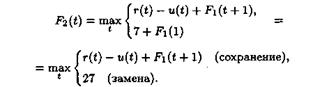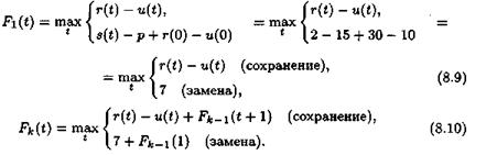 Пусть к = 2, т. е. рассмотрим прибыль за два последних года. Делаем предположение о возможном состоянии t оборудования на начало предпоследнего года. Если в начале этого года принять решение о сохранении оборудования, то к концу года будет получена прибыль r(t) - u(t). На начало последнего года оборудование перейдет в состояние t + 1, и при оптимальной политике в последнем году оно принесет прибыль, равную F1(t + 1). Таким образом, общая прибыль за два года составит r(t) - u(t) + F1(t + 1). Если же в начале предпоследнего года будет принято решение о замене оборудования, то прибыль за предпоследний год составит s(t)-p+r(0)-u(0). Поскольку приобретено новое оборудование, на начало последнего года оно будет в состоянии t = 1. Следовательно, общая прибыль за последние два года при оптимальной политике в последнем году составит