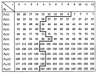 Пользуясь выражениями (8.9), (8.10), будем последовательно вычислять значения максимальной прибыли Fк(t) и записывать их в специальную таблицу (табл. 8.4). Первую строку получим, придавая параметру t в равенстве (8.9) значения 0,1,...,12 и используя исходные данные табл. 8.3. Например, при t = 0
