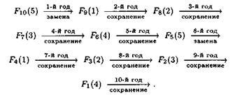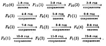 Выясняем, что значение F10(2) = 153 помещено в области сохранения. Работаем на оборудовании еще год. Теперь до конца планового периода осталось 9 лет, а возраст оборудования составляет 3 года. Находим F9(3) = 136. Это область сохранения. Работаем на оборудовании еще год. Его возраст становится равным 4 годам. До конца планового периода остается 8 лет. Определяем F8(4) = 120. Это область замен. Заменяем оборудование на новое. Проработаем на нем в течение четвертого года. Оно постареет на год. До конца планового периода останется 7 лет. Находим F7(l) = 113. Это область сохранения. Продолжив подобные рассуждения, установим, что F6(2) = 93, F5(3) = 76 расположены в области сохранения, F4(4)=60 — в области замен, F3(l) = 53, F2(2) = 33, F1(3) = 16 — в области сохранения. Разработанную политику изобразим следующей цепочкой:
